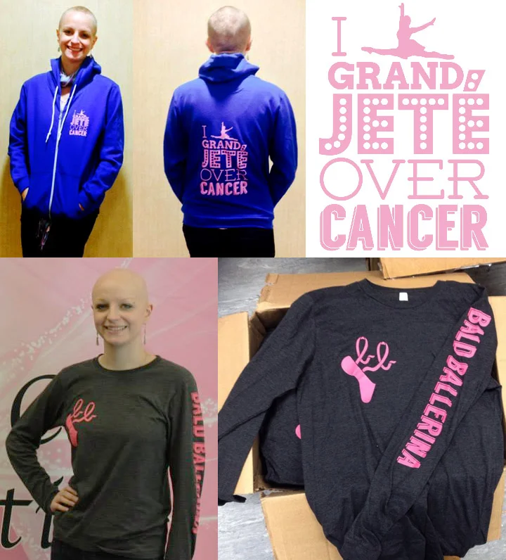 It started when I wanted to design her something to wear to empower her during her treatments. I’ve seen shirts that say things like “I kick cancer’s ass” and I wanted to design something that was more custom for her. So I first created the “I grand jeté over cancer” design (since that is her favorite move) and placed it on a zip up hoodie for her. She loves it and has worn it to all her treatments. I figured since I don’t have the tools to find a cure for cancer I could at least make something that uplifted her spirits.